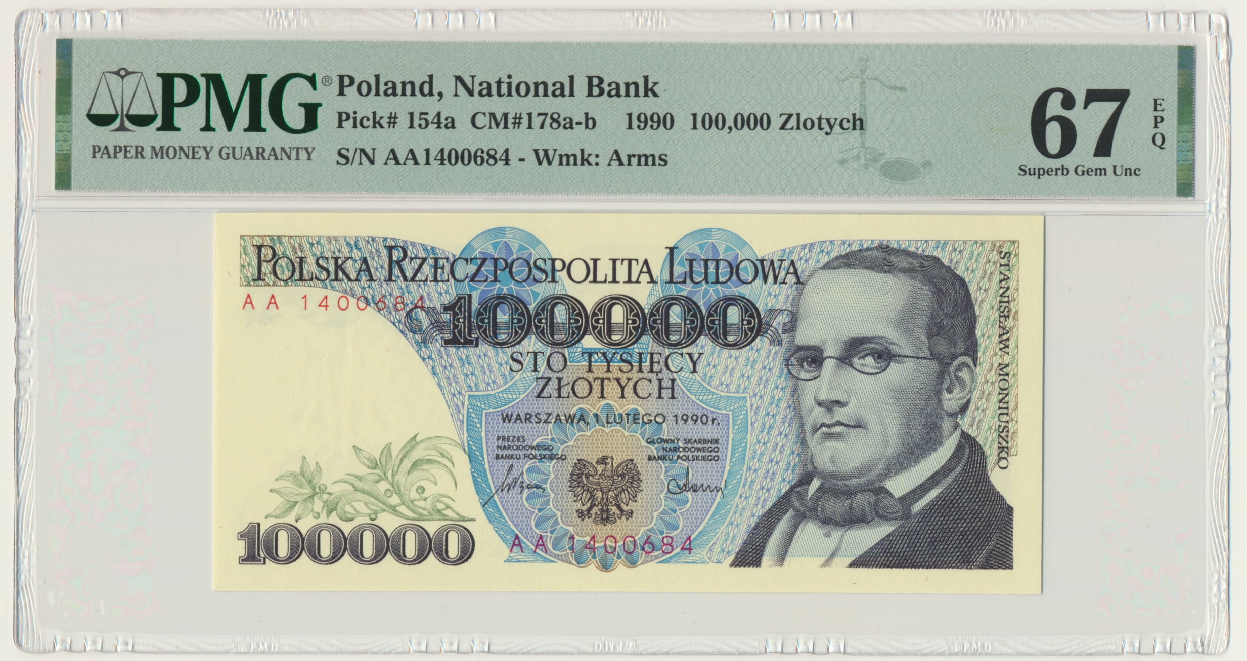 Lubiana i poszukiwana seria AA. Banknot w slabie PMG z oceną PMG 67 EPQ. Egzemplarz naturalny.