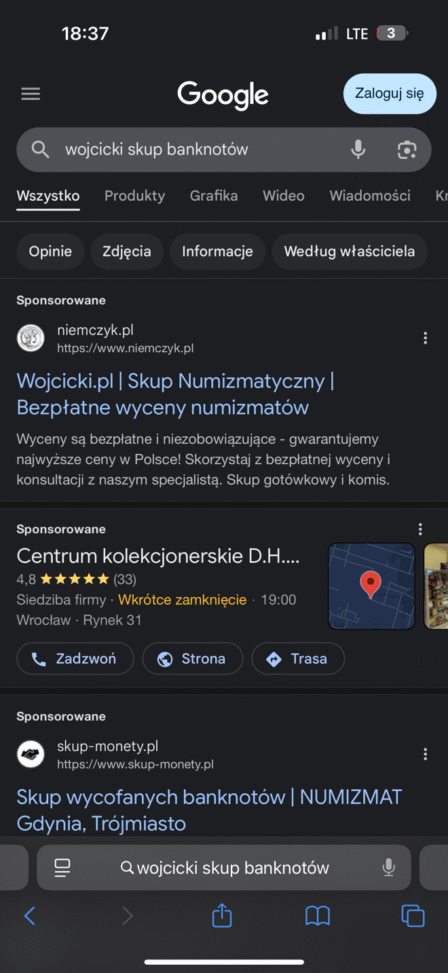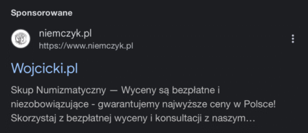 Reklamy wyświetlały się przy wyszukiwaniach takich jak: „wojcicki skup monet", „wojcicki.pl skup monet", „wojcicki skup numizmatów". W treści samych reklam pojawiały się zaś zwroty takie jak „Wojcicki.pl", „Wojcicki.pl | Najwyższe ceny w Polsce” lub „Wojcicki.pl | Bezpłatne wyceny numizmatów”.