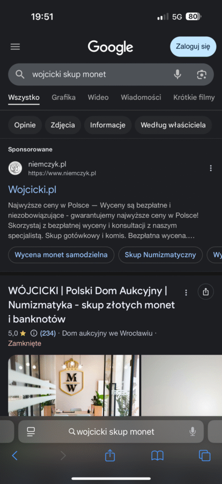 W październiku 2025 r. stwierdziliśmy, że w systemie Google Ads wyświetlają się reklamy zawierające nasze oznaczenia „Wojcicki.pl" i „Wojcicki Dom Aukcyjny", które prowadziły jednak do strony konkurencyjnej firmy niemczyk.pl, a nie do wojcicki.pl.